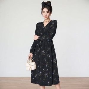 QY夏秋法式绝美V领碎花连衣裙女2025气质收腰长裙茶歇裙